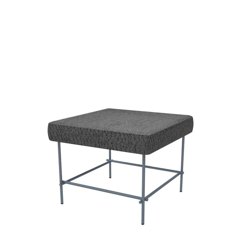 Square ottoman on steel frame with upholstered seat. 60cm / 24″ diameter.