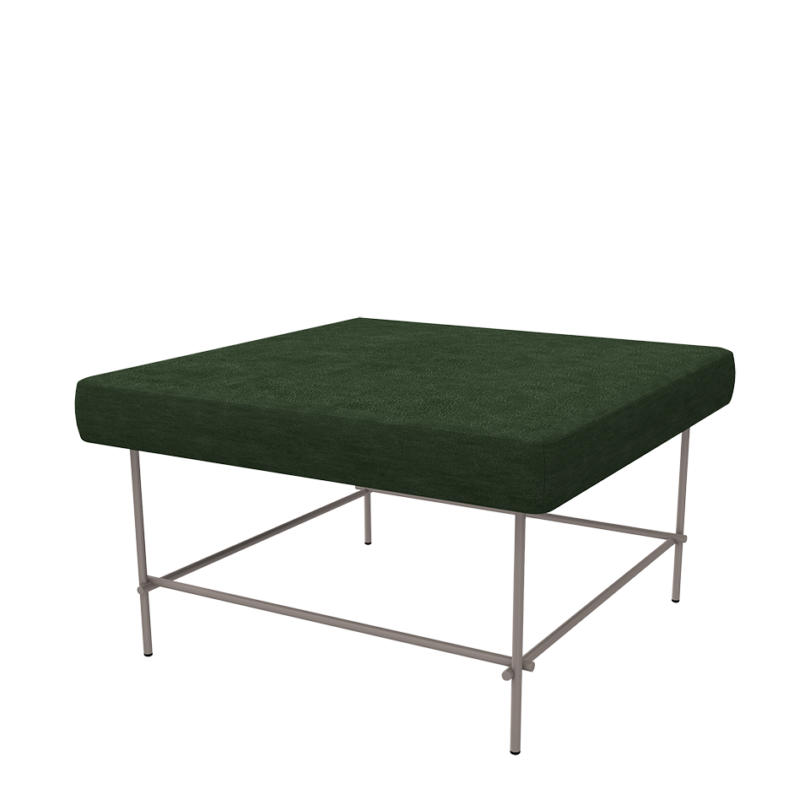Square ottoman on steel frame with upholstered seat. 80cm / 32″ diameter.