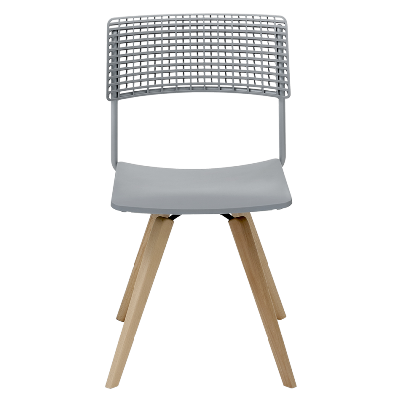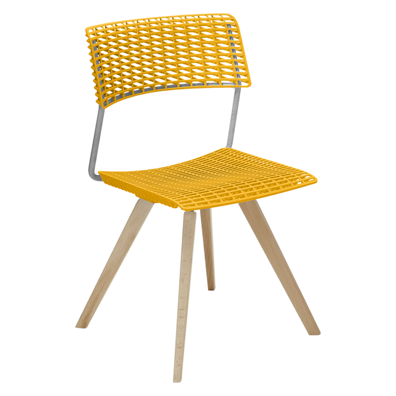 Sidechair on wood legs with steel frame and solid polypropylene seat & 3D Polypropylene mesh back. MOQ 10pcs