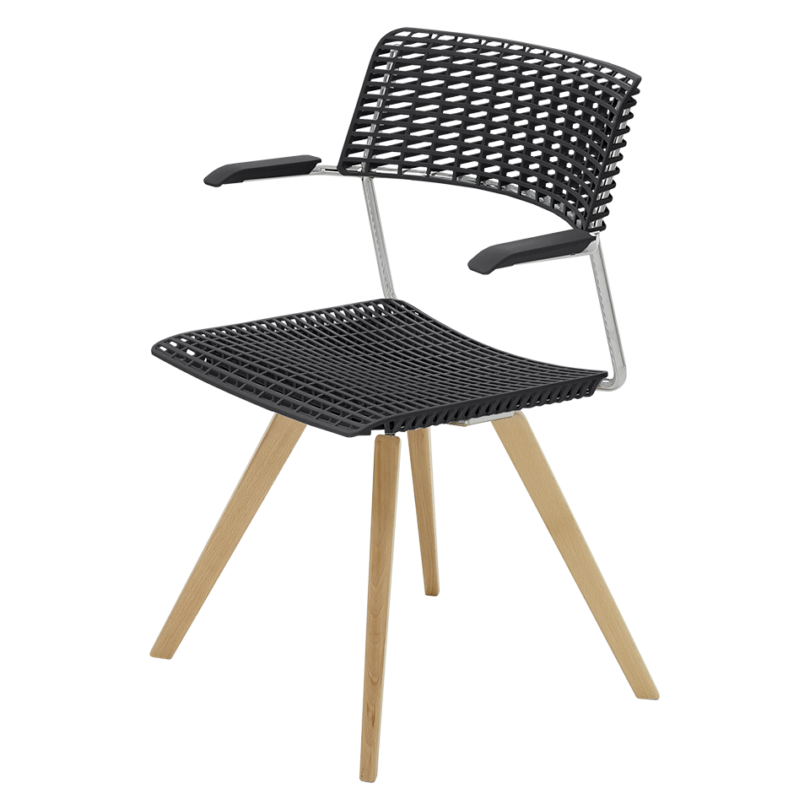 Armchair on wood legs with steel frame and 3D polypropylene mesh seat & back. MOQ 10pcs