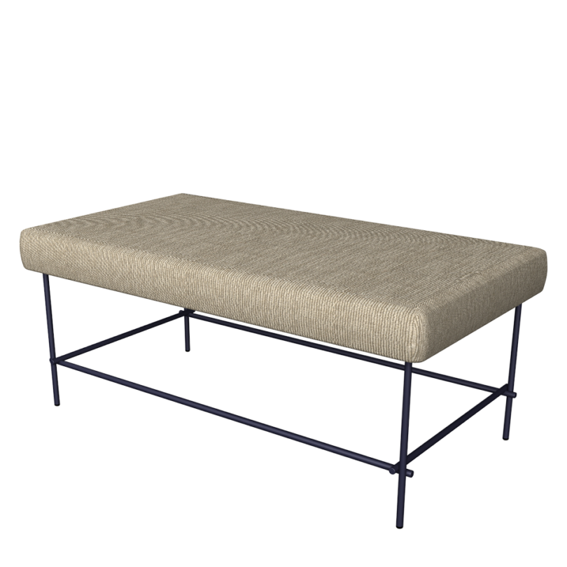 Upholstered rectangular bench with 4 leg frame. The seat cushion is made of polyurethane foam covered with soft fiber. The frame is made of round steel tube legs and steel rod crossbars.