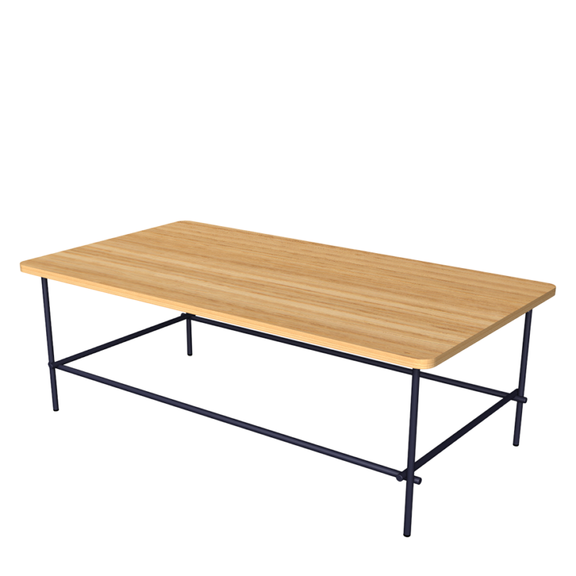 Coffee table with 4 leg frame. The frame is made of round steel tube legs and steel rod crossbars.
