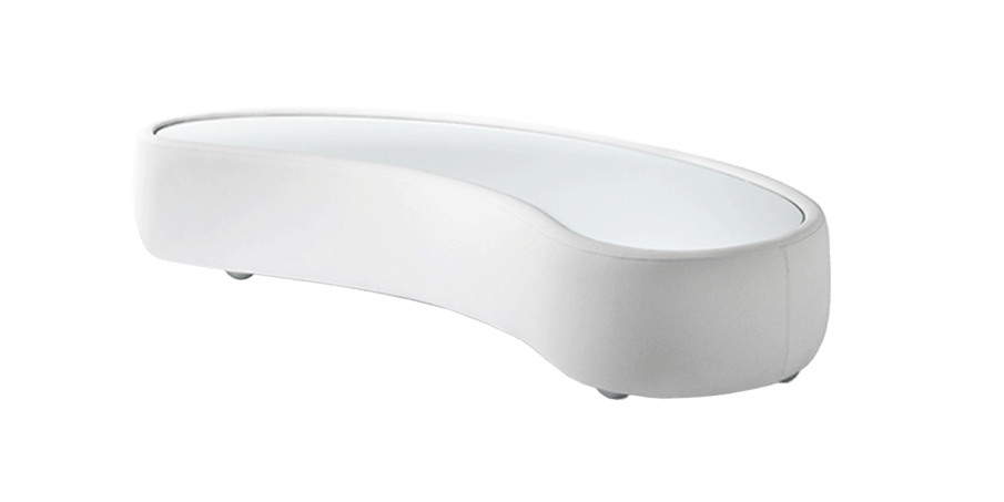 Coffee table with plywood frame. Fabric upholstered onto frame. Top in transparent, tempered glass. With rounded black colored plastic feet.