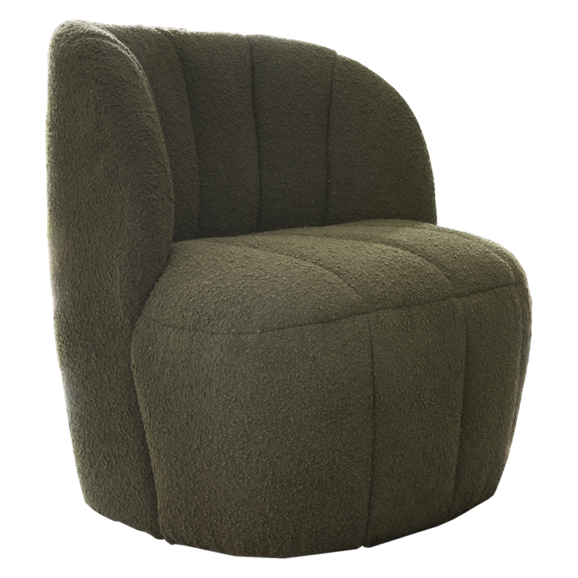 Lounge armchair with low backrest and four spoke base with upholstered seat shell and arms. Horizontal stitching detail on inside back.