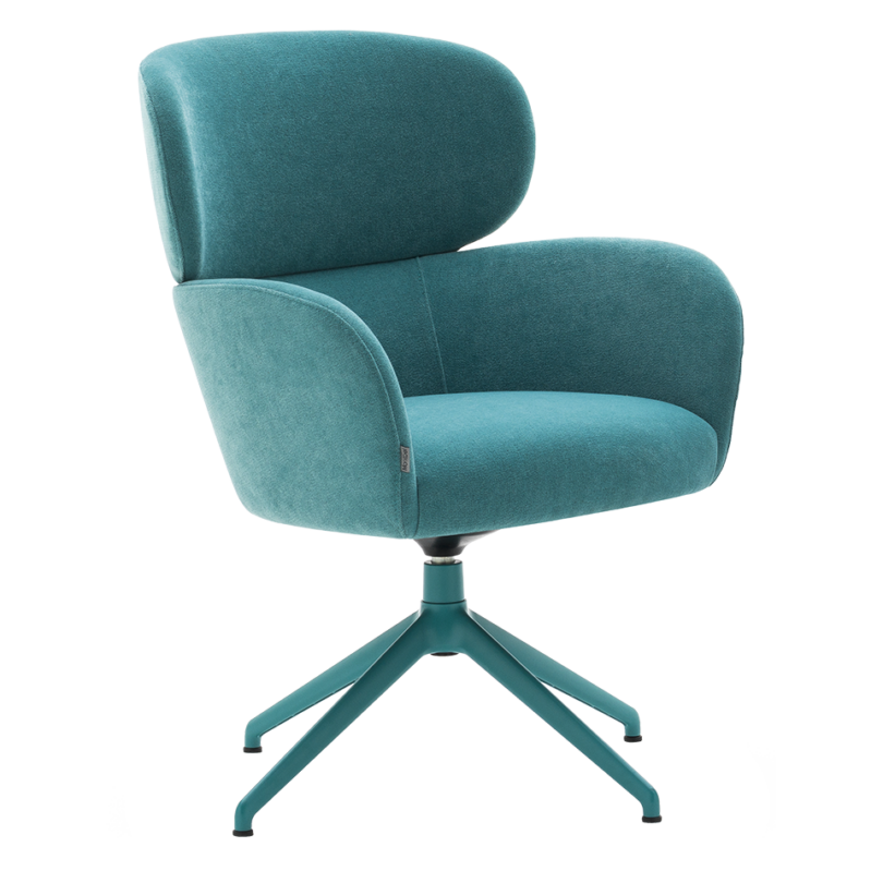 Armchair, seat frame with rounded edges. Shell with two foam elements. Webbed seat. Upholstered onto the frame. 4-spoke swivel Nylon base.