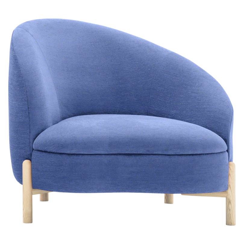 Lounge armchair with low backrest, 4 leg frame and wooden arms with soft upholstered seat shell.